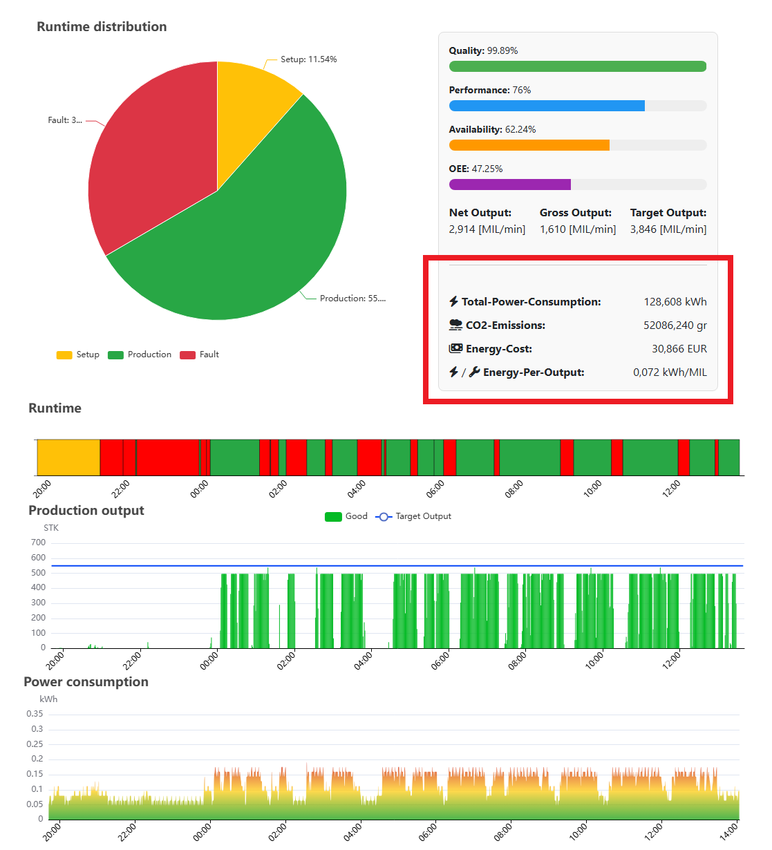 Dies macht die Lösung besonders interessant für Unternehmen, die die hohen Kosten für die Installation einer umfassenden MES-Lösung (Manufacturing Execution System) scheuen. Statt einer teuren und komplexen MES-Implementierung können Sie einfach die Energieverbrauchsdaten nutzen, um Einblicke in die Nutzung Ihrer Maschinen zu gewinnen.